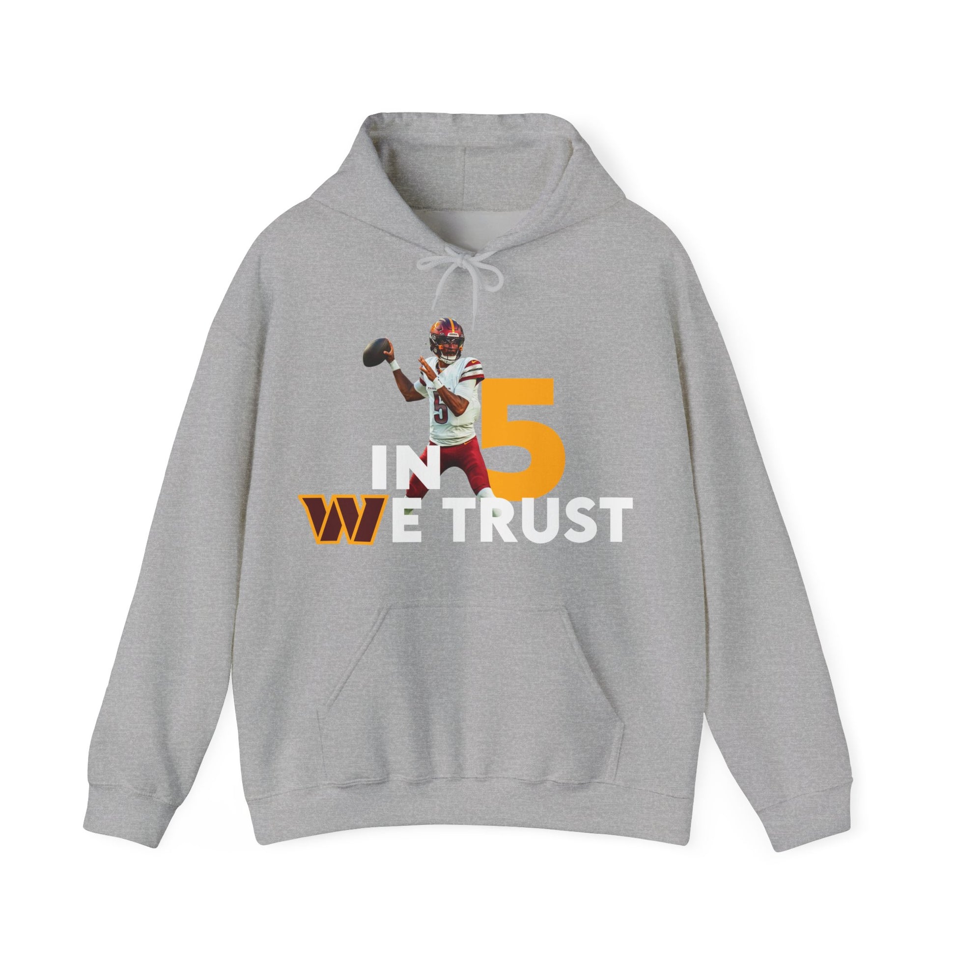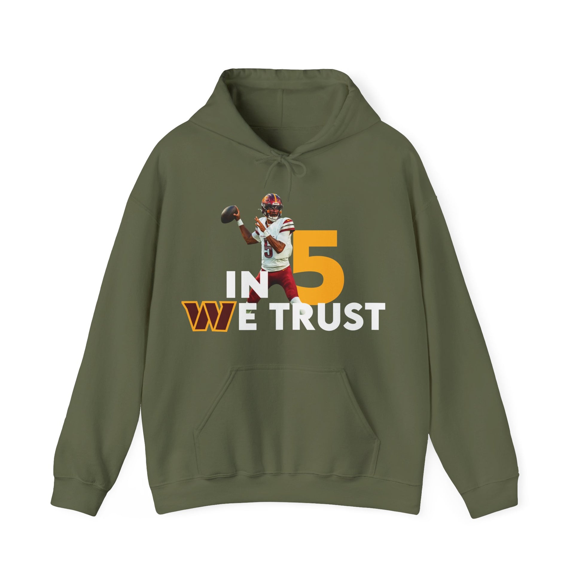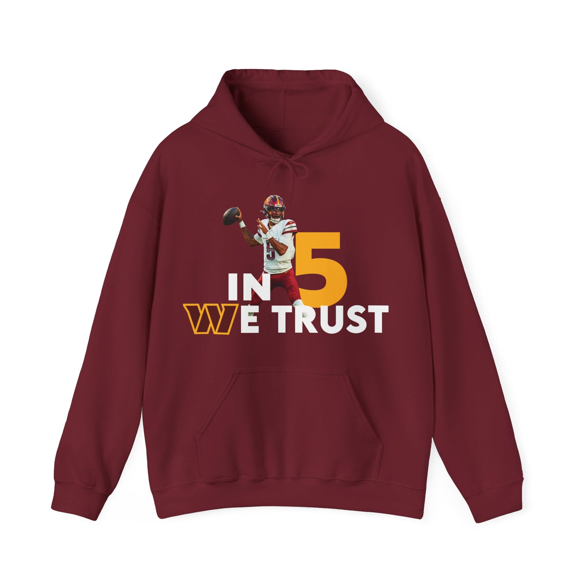 Show your Commanders pride with the bold “In 5 We Trust” Hoodie, celebrating the future of Washington football. Designed with fans in mind, this hoodie highlights the excitement around #5 Jayden Daniels and the new era he represents.